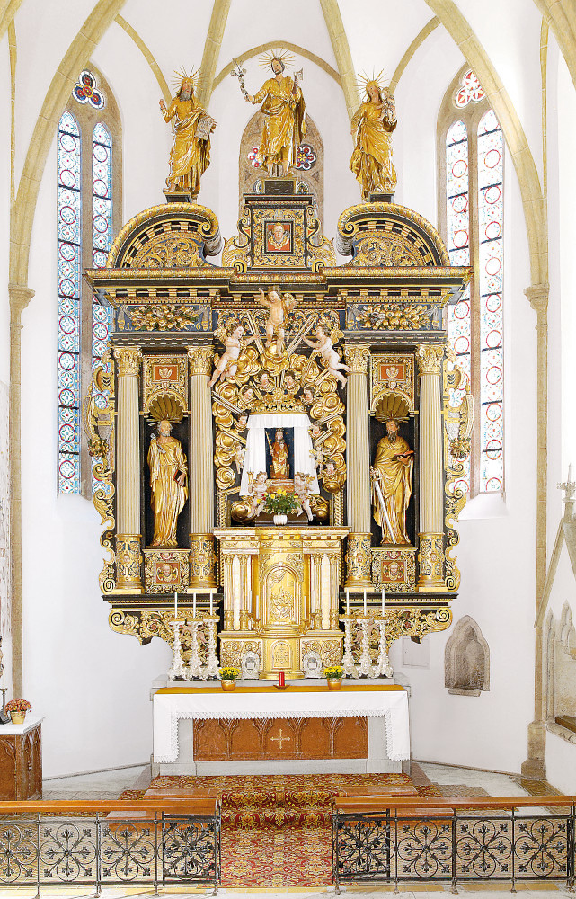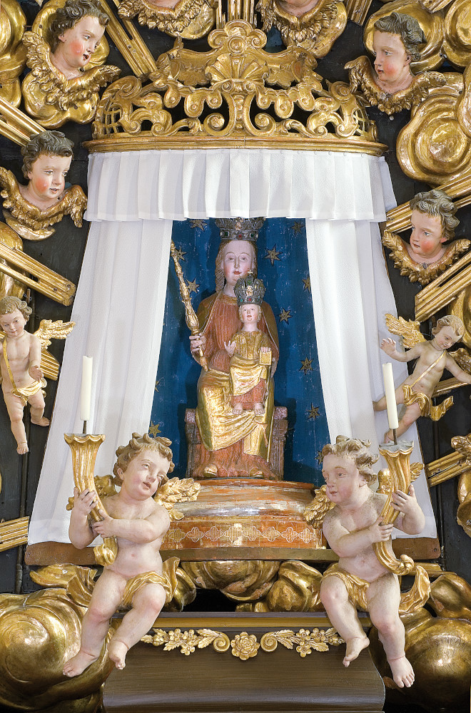 Ein weiteres Kunstwerk stellt die Marienkrönungsgruppe auf einem Tischaltar der Südempore dar. Sie stammt aus der Zeit um 1460 und dürfte mit ziemlicher Sicherheit der letzte Überrest des ehemaligen, gotischen Hochaltares der Kirche sein.